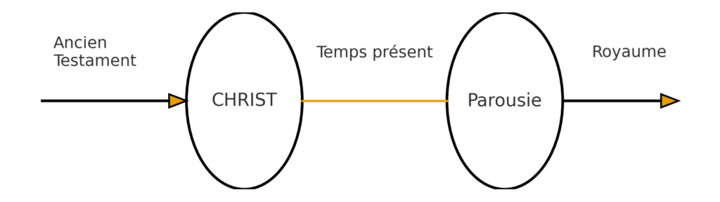 Le temps de l’attente va de la création jusqu’à la venue du Christ. L’Évangile n’annule pas, ne rejette donc pas l’Ancien Testament, en qui il voit un temps de préparation. Ce temps se termine avec la venue de Jésus. Commence, ensuite, une période nouvelle, intermédiaire, celle que nous vivons actuellement ; elle va de la Résurrection à la Parousie. L’événement eschatologique, que les juifs croyaient unique, se scinde en deux. Il se compose de deux moments distincts séparés par un intervalle dont nous ignorons l’exacte durée.
