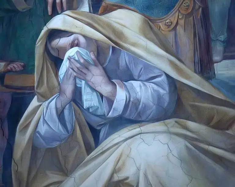 Illustration : tableau du musée de Rome représentant une femme en deuil (combat entre les Horaces et les Curiaces - Image: 'A Roman woman weeps in a detail from the fresco Battle between the Horatii and the Curiatti (1612-1613+CE)' by Mary Harrsch https://creativecommons.org/licenses/by-nc-sa/2.0/ http://www.flickr.com/photos/44124324682@N01/6866406715