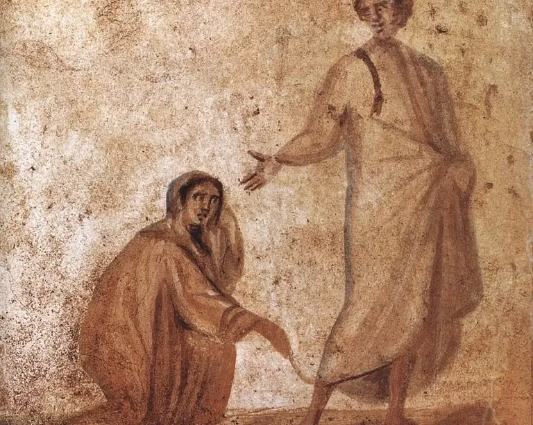 Fresque dans une catacombe de Rome représentant la femme ayant une hémoragie touchant le bord du manteau de Jésus