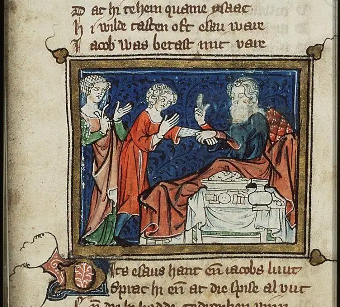 Jacob obtient la bénédiction de son père en présence de Rebecca; MICHIEL ; 1332 enluminure sur vélin; manuscrit "Den Haag, MMW, 10 B 21" ; Bibliothèque royale , La Haye